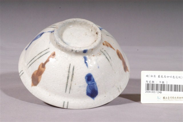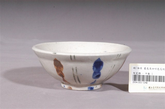 1.青花褐彩生意碗,撇口,折沿,緣口凹線以下呈圓弧形下收,底有圈足。以模具成形,施釉彩繪裝飾後高溫燒成,整體造型略微歪斜。全器滿釉,施罩白釉,碗外壁開片。碗內壁素面無紋,碗外壁用青花與褐彩裝飾,以外底心為中心,呈放射狀繪製雙線紋將碗身分成六等份,雙線中間以青色和褐色交錯妝點水滴形與直線組成的長條色塊,紋飾釉料延伸到圈足。2.生意碗為小吃攤喜愛使用,業者稱為「生意碗」的小吃碗,常見於滷肉飯、肉圓、肉羹等小吃攤。它的形制相當特別,通常胚體厚重,外折的口沿使碗面看起來比一般飯碗大,但碗的下半部向內收縮,碗身也淺,因此在視覺及重量上會讓客人覺得食物份量很多,但實際盛裝的並不多。