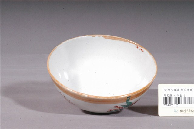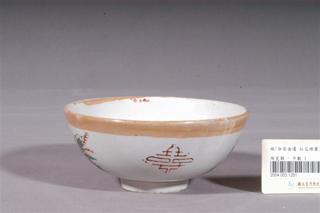 1.金黃閃光釉花卉囍字紋碗,以模具成形,施白釉高溫燒製後,再以金黃閃光釉與紅綠彩裝飾二次燒製而成。敞口,弧壁下收,圓腹,底有圈足,全器除圈足底露胎外滿釉,胎色灰褐,圈足部分缺損並可見小裂紋。碗內壁素面無紋,口沿內側沾染到些許金黃色閃光釉與朱紅色釉料,碗外壁口緣與近底處裝飾二圈寬邊金黃色閃光釉,上圈紋有流釉現象,腹部二側採印花技法蓋印二朵形似玫瑰的紅花,與二菱形囍字紋交錯排列,花葉部分以綠色釉彩手繪填色裝飾。外底心印有紅色正方形「新藝」字樣落款,標示此碗出處。2.金黃色閃光釉(Luster)是一種低溫釉上彩,燒製溫度約750℃,施在白色釉藥上,因色料中的金屬氧化物沈澱,使釉面產生金屬光澤。閃光釉發源於中東回教國家,傳入歐洲後成為廣受歡迎的裝飾技法,之後再經由日本傳到臺灣,約於1960年代至1970年代流行於臺灣北部窯廠,搭配吉祥字樣曾廣受宴會場合歡迎,但由於容易褪色,後來便不多見了。