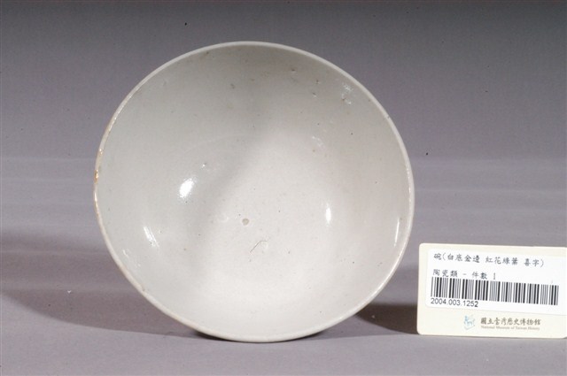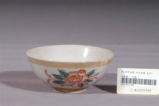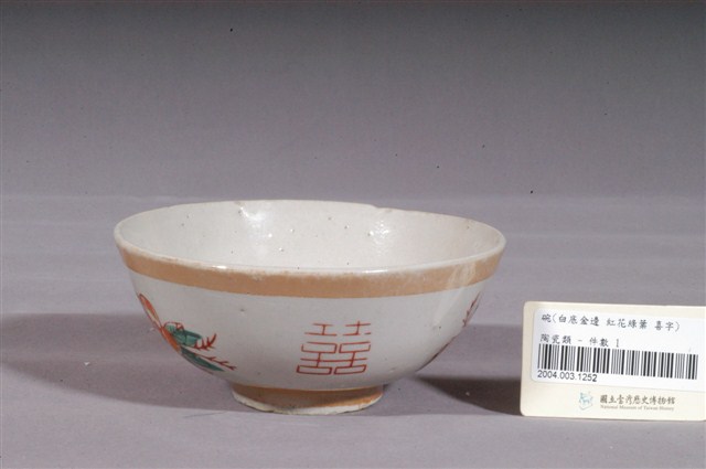 1.金黃閃光釉花卉囍字紋碗,以模具成形,施白釉高溫燒製後,再以金黃閃光釉與紅綠彩裝飾二次燒製而成。敞口,弧壁下收,圓腹,底有圈足,全器除圈足底露胎外滿釉,胎色灰白。碗內壁素面無紋,碗心有一圓點狀剝釉與一短裂紋,口緣有些許氣孔,碗外壁口緣與近底處裝飾二圈寬邊金黃色閃光釉,上圈紋略褪色,腹部二側採銅版轉印貼繪技法裝飾二朵形似玫瑰的紅花,與二囍字紋交錯排列,花瓣紋路以朱紅色料蓋印,增添層次感,花葉部分以綠色釉彩手繪填色裝飾。外底心印有紅色正方形回紋飾邊「安本出品」字樣落款,標示此碗出處。2.金黃色閃光釉(Luster)是一種低溫釉上彩,燒製溫度約750℃,施在白色釉藥上,因色料中的金屬氧化物沈澱,使釉面產生金屬光澤。閃光釉發源於中東回教國家,傳入歐洲後成為廣受歡迎的裝飾技法,之後再經由日本傳到臺灣,約於1960年代至1970年代流行於臺灣北部窯廠,搭配吉祥字樣曾廣受宴會場合歡迎,但由於容易褪色,後來便不多見了。