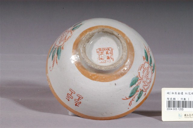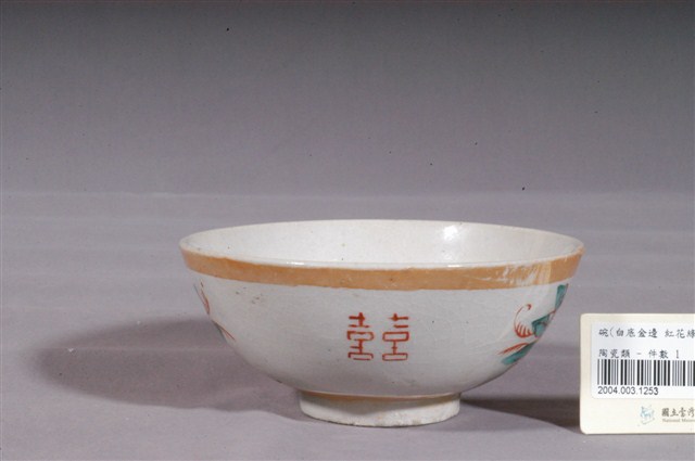 1.金黃閃光釉花卉囍字紋碗,以模具成形,施白釉高溫燒製後,再以金黃閃光釉與紅綠彩裝飾二次燒製而成。敞口,弧壁下收,圓腹,底有圈足,全器除圈足底露胎外滿釉,圈足底沾粘窯沙呈灰褐色。碗內外壁開片,表面有些許氣孔和雜質斑點,碗內壁素面無紋,碗外壁口緣與近底處裝飾二圈寬邊金黃色閃光釉,部分釉色磨損消失,腹部二側銅版轉印貼繪技法裝飾二朵形似玫瑰的紅花,與二囍字紋交錯排列,花葉部分以綠色釉彩手繪填色裝飾,囍字稍不完整。外底心印有紅色正方形圈紋飾邊「其益出品」字樣落款,標示此碗出處。2.金黃色閃光釉(Luster)是一種低溫釉上彩,燒製溫度約750℃,施在白色釉藥上,因色料中的金屬氧化物沈澱,使釉面產生金屬光澤。閃光釉發源於中東回教國家,傳入歐洲後成為廣受歡迎的裝飾技法,之後再經由日本傳到臺灣,約於1960年代至1970年代流行於臺灣北部窯廠,搭配吉祥字樣曾廣受宴會場合歡迎,但由於容易褪色,後來便不多見了。