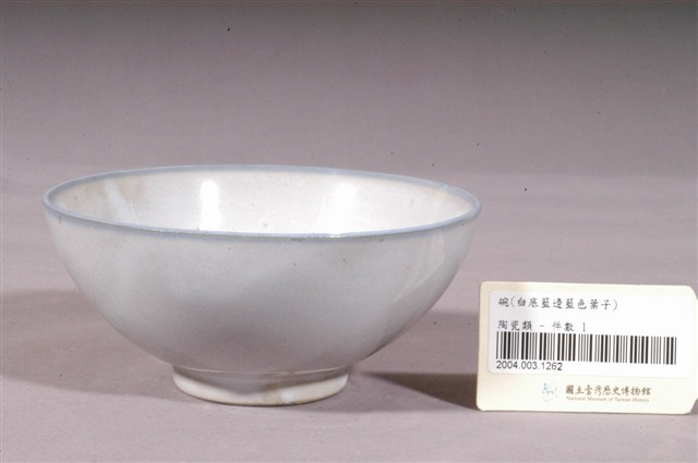 1.青花竹葉紋碗,敞口,弧壁下收,圓弧腹,底有圈足,以模具成形,施鈷料彩繪裝飾後高溫燒製而成。全器施白釉,釉色略帶乳白色調,釉層分佈不均,碗外壁下半、圈足內外、碗底心與內緣口一側幾處釉層較薄的地方略透胎土褐色,圈足底露胎,胎為褐色。碗口沿以青色鈷料塗滿,碗內壁素面無紋,碗外壁一側以青花鈷料裝飾竹葉紋,利用釉色深淺創造立體感,整體色彩淡雅清新。2.碗的形制有分較大、臺灣民間俗稱「碗公」的湯碗和形制較小的飯碗。本物件屬於形制較小的飯碗,碗壁上手繪的竹葉紋為鶯歌碗盤中常見的紋飾,從日治時期一直沿用到光復以後,竹子為松、竹、梅歲寒三友之一,象徵著文人的高尚志節。