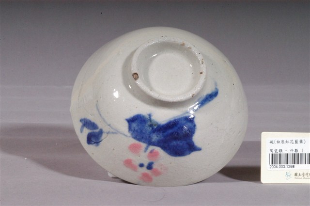 1.青花粉紅彩花卉紋碗,敞口,弧壁下收,圓腹,底有圈足,以模具成形,於白色長石釉上裝飾彩釉之後,高溫燒製而成。全器滿釉,表面帶有氣孔與雜質斑點,圈足底略有缺損露胎呈紅褐色,碗外壁細小開片。碗內壁素面無紋,一側表面凹凸不平,緣口有二道青色短線,應為彩繪施作時不小心畫到所致。碗外壁一側以青花、粉紅釉彩,彩沒骨技法手繪折枝花卉。2.粉紅彩紋飾經常出現在鶯歌碗盤中,這種釉彩的應用在日治時期已開始流行,戰後仍沿用許久。粉紅彩傳入臺灣後,臺灣北部窯廠紛紛開始模仿,由於鶯歌窯的發展在北投窯之後,當時許多北投窯的工人遷居到鶯歌,同時將紋飾帶去,因此推測粉紅釉彩的流行也是從北投傳到鶯歌。