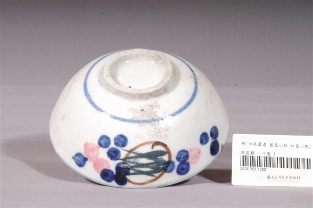 1.彩繪幾何紋碗,敞口,弧壁下收,圓腹,底有圈足,以模具成形,於白色長石釉上裝飾彩釉之後,高溫燒製而成。全器施白釉,碗外壁腹部略微縮釉,部分剝釉,圈足底露胎,胎色米白。口沿以青色鈷料塗滿,發色較淡,碗內壁素面無紋,碗外壁下方飾一圈青花弦紋,腹部一側以褐、綠、青、粉紅釉彩手繪圓圈、菱格、圓點等幾何紋飾,豐富的色彩使簡單的圖案顯得活潑。2.粉紅彩紋飾經常出現在鶯歌碗盤中,這種釉彩的應用在日治時期已開始流行,戰後仍沿用許久。粉紅彩傳入臺灣後,臺灣北部窯廠紛紛開始模仿,由於鶯歌窯的發展在北投窯之後,當時許多北投窯的工人遷居到鶯歌,同時將紋飾帶去,因此推測粉紅釉彩的流行也是從北投傳到鶯歌。