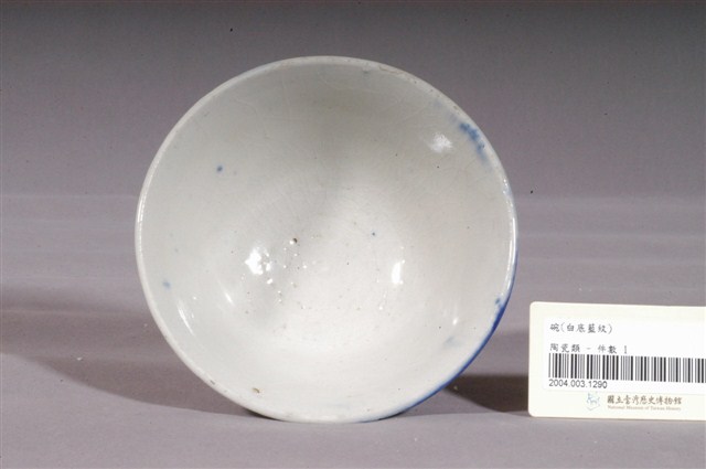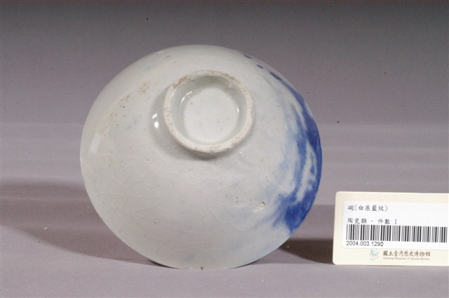 1.噴繪青花富士山紋碗,以模製成形,敞口,弧壁向下斜收至底,底有圈足。全器施白釉,碗內外壁皆開片,碗心有明顯氣孔,圈足底極少部分露胎,呈淺褐色。碗內壁素面無紋,口沿沾染些許青色釉料,碗外壁一側採用噴繪技法,以青花鈷料裝飾紋樣,圖案頗為模糊,呈霧狀,推測為失敗作品,依裝飾技法與圖案輪廓比對本館其他類似物件如2004.003.1291,可知原裝飾紋樣為富士山圖案。2.噴繪技法是鐵片或銅版先將圖案做成鏤空的版型,再將版型貼近胚體,使用噴槍將色料噴上去,鏤空的地方沾上色料,被覆蓋的地方留白,燒製後即成所需圖案。噴繪技法是從日本引進,最早多用在富士山圖案的繪製,後來也設計出白兔、鶴紋、魚蝦等造型。