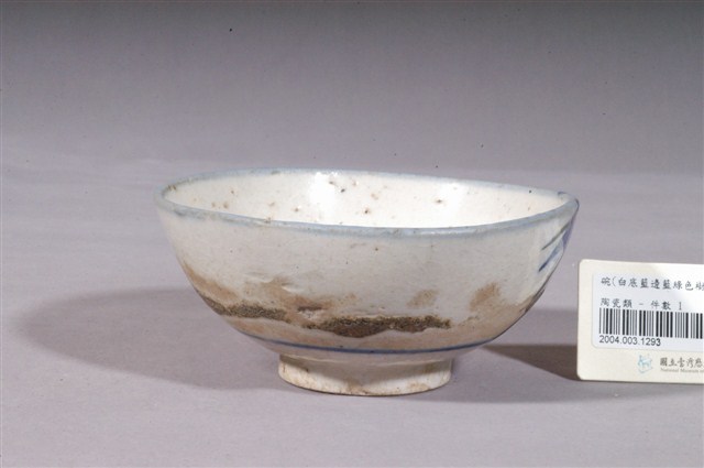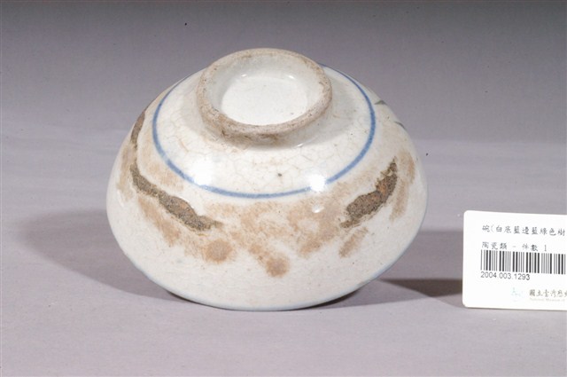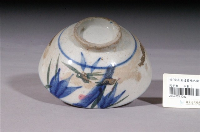 1.彩繪竹紋碗,敞口,弧壁下收,圓腹,底有圈足,以模具成形,施釉料彩繪裝飾後高溫燒製而成,整體造型略微歪斜。全器施白釉,圈足底露胎,胎色米白。碗外壁開片,腹部下方有一圈剝釉露胎痕跡,可能為入窯燒造時二件陶器疊壘所留下。口沿以青色鈷料塗滿,發色較淡,碗內壁素面無紋,表面可見明顯氣孔,碗外壁下方飾一圈青花弦紋,腹部一側以青花與綠彩裝飾竹枝與竹葉紋,中間綴粉一點粉紅小花。2.碗的形制有分較大、臺灣民間俗稱「碗公」的湯碗和形制較小的飯碗。本物件屬於形制較小的飯碗,碗壁上手繪的竹葉紋為碗盤中常見的紋飾,從日治時期一直沿用到光復以後,竹子為松、竹、梅歲寒三友之一,象徵著文人的高尚志節。粉紅彩的應用也是從日治時期開始流行沿用到戰後,粉紅彩傳入臺灣後,臺灣北部窯廠紛紛開始模仿,從窯業發展歷史與紋飾變化,推測此種釉彩的流行是從北投傳到鶯歌。