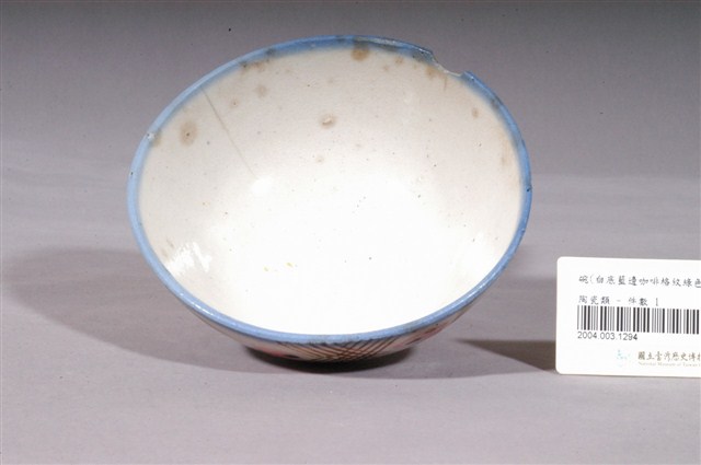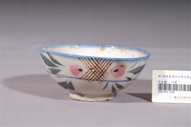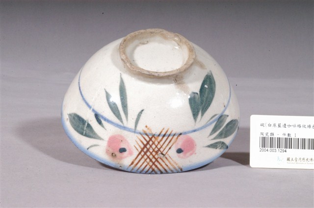 1.彩繪花卉幾何紋碗,敞口,弧壁下收,圓弧腹,底有圈足,以模具成形,施釉料彩繪裝飾後高溫燒製而成。全器施白釉,表面帶有氣孔,圈足底露胎,胎色灰褐,圈足部分缺損且有小裂縫。口沿以青色鈷料塗滿,碗內壁素面無紋,碗外壁中段裝飾一圈青花弦紋,腹部一側以綠、褐彩、粉紅彩描繪花卉與菱格紋,紋樣大致呈左右鏡像對稱,以褐色菱格為中心,左右各繪一粉紅圓點,以綠彩點綴花芯,並繪葉片。外器壁佈滿細小開片,口沿有一弧形碰撞缺口及一道裂痕向下延伸至腹部,內外口緣有點狀淺褐色汙漬痕。2.粉紅彩紋飾經常出現在鶯歌碗盤中,這種釉彩的應用在日治時期已開始流行,戰後仍沿用許久。粉紅彩傳入臺灣後,臺灣北部窯廠紛紛開始模仿,由於鶯歌窯的發展在北投窯之後,當時許多北投窯的工人遷居到鶯歌,同時將紋飾帶去,因此推測粉紅釉彩的流行也是從北投傳到鶯歌。