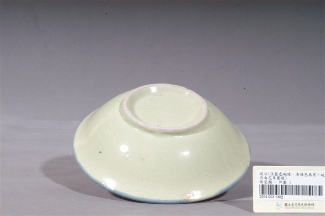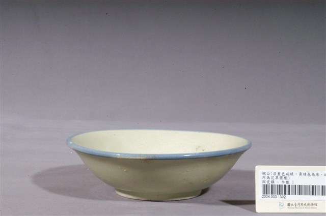 1.黃綠釉手繪白梅花紋碗公,以模製成形,撇口,弧壁下收,圓腹,碗底寬大,碗身淺,底有圈足帶小缺角。全器施淡黃綠釉,碗內外壁釉面開片,器表略有氣孔,圈足底露胎,胎色米白。口沿施一圈淡藍色釉,碗外壁素面無紋,主要紋飾繪於碗心一側,以褐彩描繪梅枝,樹梢上二朵白色盛開的梅花旁綴以莓紅色圓點,並襯深綠色枝葉,深色枝葉與淺色花朵呈現明顯對比。2.碗的形制有分較大的湯碗和較小的飯碗,湯碗臺灣民間俗稱「碗公」,多用來盛裝菜湯,是臺灣家庭中常見的民生瓷器。此碗為形制較大的湯碗,碗壁上的白梅花圖案為當時流行的裝飾題材。