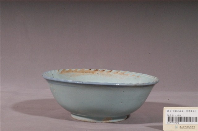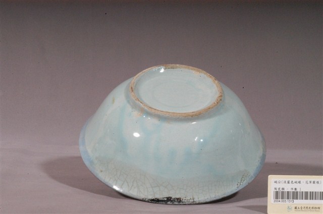 1.淡藍釉彩繪花卉紋碗公,撇口,弧壁下收,圓腹,底有圈足,以模製成形,口緣刻劃連續細斜線作為花邊,外碗心特意壓模同心圓形,但被釉料覆蓋不甚明顯。全器施淡藍釉,釉層施塗不均,碗外壁流釉,口緣一側長條形面積開片,其內側剝釉露胎,圈足底露胎,胎為淺褐色。口沿依稀可見一圈較深的青色裝飾,碗外壁素面無紋,主要紋飾繪於碗內壁一側,以紅、綠彩描繪花卉紋,二朵盛開紅花旁以綠彩寫意枝葉,可能為牡丹之類的花卉,對比色彩生動活潑,春意盎然。2.碗的形制有分較大的湯碗和較小的飯碗,湯碗臺灣民間俗稱「碗公」,多用來盛裝菜湯,是臺灣家庭中常見的民生瓷器。此碗為形制較大的湯碗,約於光復初期代由臺灣北投窯場燒造,碗壁上的折枝花卉圖案為當時流行的裝飾題材。