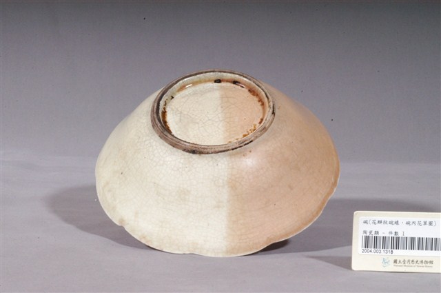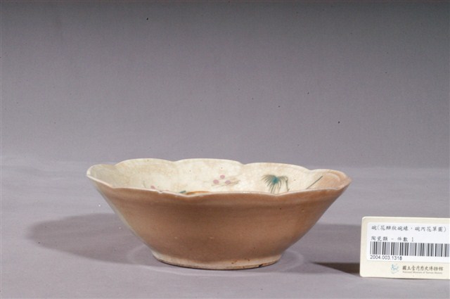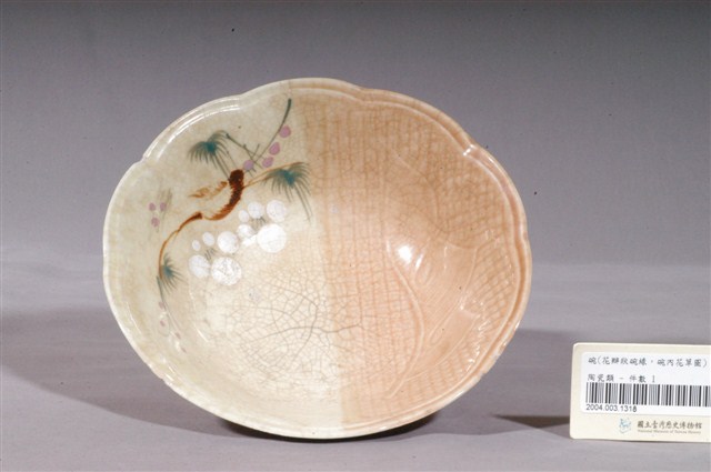1.手繪白梅花紋雙色花口碗公,以模製成形,採用壓模裝飾淺浮雕圖案,施釉彩繪裝飾後高溫燒成。敞口,碗口沿作十瓣花口造型,斜壁略帶波浪起伏向下略斂,碗底寬大,底有圈足,圈足底留有一圈壓模痕跡。碗外壁素面無紋,口沿內側依碗口造型壓印一圈花瓣線紋,碗內壁一側半月形面積以壓模裝飾類似芭蕉葉的紋飾,並以小方格紋為襯底。碗內外壁施釉,淺浮雕紋飾部分施罩粉紅色釉,其餘面積施白釉,白釉部分近口緣處手繪二朵白梅花,旁綴以莓紅色圓點,並襯褐色及深綠色枝葉,深色枝葉與淺色花朵呈現明顯對比。此碗頗具歷史風霜,整只碗被汙漬覆蓋,碗內外壁佈滿開片,碗底圈足更有厚積的深褐色汙漬。2.碗的形制有分較大的湯碗和較小的飯碗,湯碗臺灣民間俗稱「碗公」,多用來盛裝菜湯,是臺灣家庭中常見的民生瓷器。此花口碗為形制較大的湯碗,碗壁上的白梅花圖案為當時流行的裝飾題材,其口沿特意做成花口邊,頗具特色,葵花、菱花、荷花都是常見的花口造型。