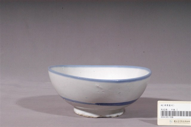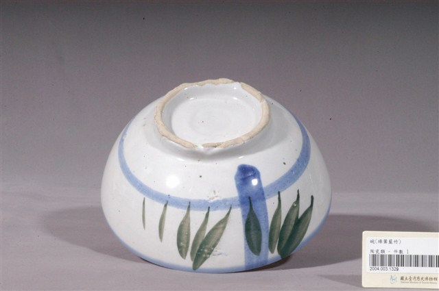 1.彩繪竹紋碗公,敞口,口沿略呈波浪起伏,弧壁下收,圓腹,底有圈足,以模具成形,施釉料彩繪裝飾後高溫燒製而成。全器施白釉,碗外壁腹部略縮釉,圈足底露胎,胎為白色,圈足略有缺損。口沿以青色鈷料塗滿,碗內壁素面無紋,碗外壁中下段飾一圈青花弦紋,粗細不均等,可看到繪製時開始和結束的筆觸,腹部一側以青花與綠彩裝飾竹幹與竹葉紋,利用釉色深淺創造立體感。2.碗的形制有分較大的湯碗和較小的飯碗,湯碗臺灣民間俗稱「碗公」,多用來盛裝菜湯,是臺灣家庭中常見的民生瓷器。本物件屬於形制較大的湯碗,碗壁上手繪的竹葉紋為碗盤中常見的紋飾,從日治時期一直沿用到光復以後,竹子為松、竹、梅歲寒三友之一,象徵著文人的高尚志節。