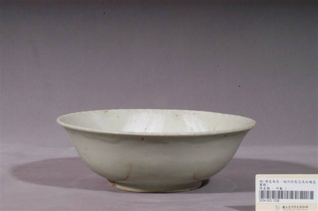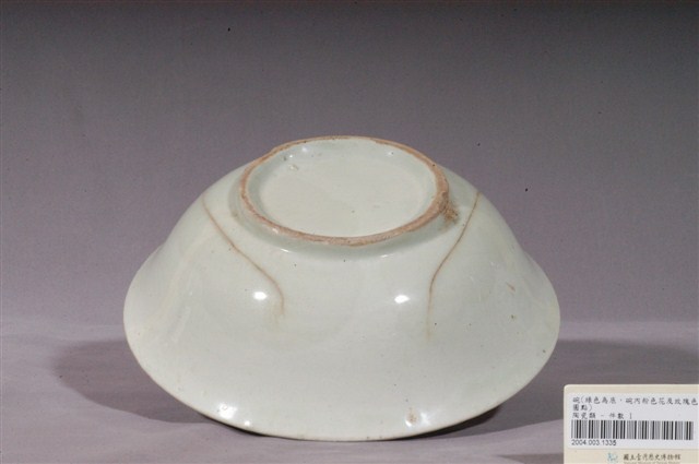 1.本件為彩繪花卉紋碗,器形呈撇口,弧壁,淺圈足。淺綠釉色,內外壁光滑,器腹底部有兩道咖啡色裂痕。碗內面圖案以畫筆沾取白色色料沿著碗底邊緣劃出一粗獷的井字作為底圖,再以棕色、綠色、深淺粉紅色在白色底圖上,繪出折枝花紋,畫風簡單樸實。鶯歌碗盤上的紋飾大多以手繪方式表現,粉紅色釉彩的使用亦是鶯歌日用陶瓷裝飾的特點。2.鶯歌陶業始於清嘉慶九年,來自福建泉洲磁灶的吳姓陶工,在此燒製土器及陶器。清代及日據時期,此地窯業以家族經營為主。1930–1960年代,鶯歌成為臺灣燒製碗盤的主要地區,因此臺灣有句俚語:「三峽出土炭, 鶯歌燒碗盤」。1969年北投陶瓷廠關閉,許多窯場逐漸轉移到臺北市近郊的鶯歌地區。使鶯歌地區因為地緣性的關係,發展成為臺灣陶瓷重鎮。
