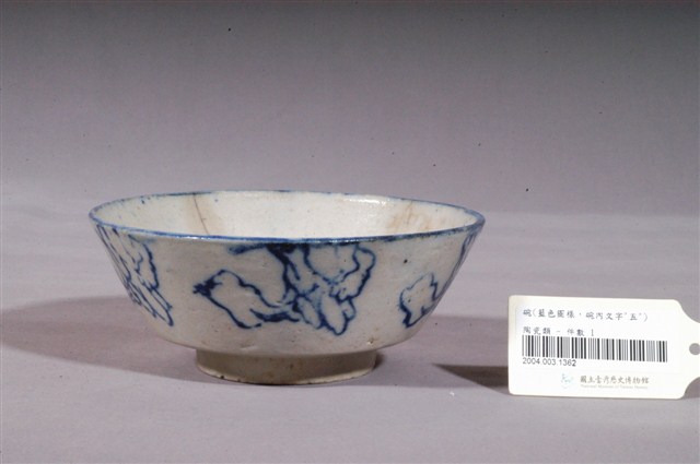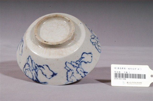 1.本件青花山石紋碗,為中國廣東地區產製。直口,斜直壁,壁至底部內折,下接圈足。通體施釉,以灰釉為地,並以青花釉彩為裝飾。碗內除口沿塗一圈青料,底部也繪一圈弦紋,中心並蓋印「五」字。外壁繪一圈山體岩石紋樣。整體裝飾簡單素樸,為大量產製的民用陶瓷器皿。2.十六世紀晚期,時值歐洲大航海時代,華南沿海地區因出口貿易便利的地理優勢,窯業也跟著興起。窯廠至日治時期仍持續生產碗盤外銷,而這些產品也透過貿易往來傳入臺灣,豐富了臺灣常民的生活文化。