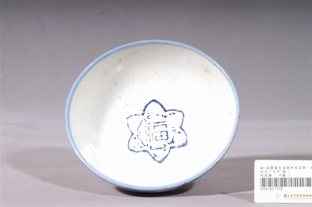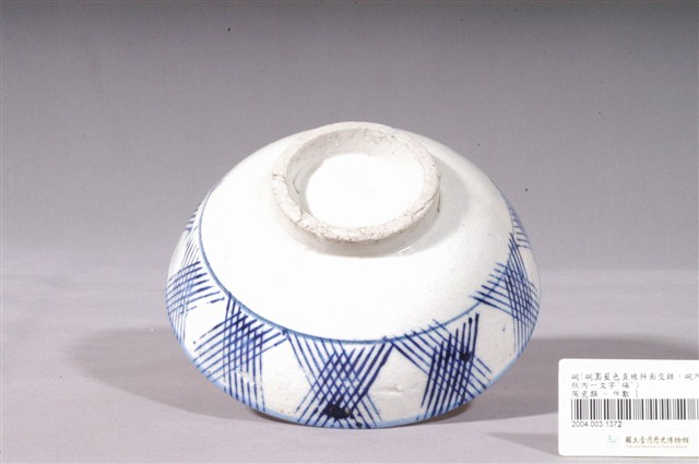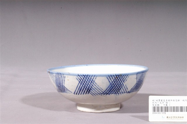 1.本件為青花福字線紋碗,圓唇,敞口,深圓腹,弧壁下收,厚圈足。圈足露胎,胎土潔白。除圈足外通體施釉,並以青花釉彩描繪紋飾。口沿畫一道淺藍色橫線,內底使用印花裝飾技法蓋印青花六角星形福字圖樣;外壁腹部繪一道弦紋,以橡皮印章在口沿至弦紋間蓋上一組一組交錯的青花斜線,形成斜面交錯網格的紋樣,為北投燒、大屯燒兩大系統陶瓷廠常見的日用陶瓷裝飾。2.相較於臺灣其他地區的黏土原料大多為紅陶,北投大屯山地區則富含優良的白陶土礦。胎質色白、呈色容易的優勢,也讓北投窯的裝飾方式大部分以彩繪為主。北投窯的彩繪技法在日治時代就已經有釉上及釉下彩兩種,戰後除手工繪彩之外,也使用轉印與蓋印等印花技術,以利製作程序標準化及大量生產。