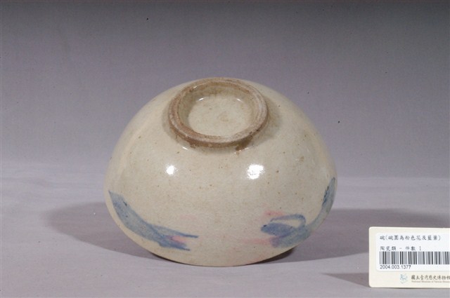 1.這件青花粉紅釉彩花卉紋碗,是鶯歌產製的日用食具。圓唇,直口,圓腹,弧壁下斂至圈足,圈足略寬。足部露胎,胎質細緻。全器施釉,釉面有光澤,略可見細微開片。碗內素面無紋,外壁近口緣處以青花粉紅彩裝飾,描繪筆觸粗略,僅以簡單幾筆點劃帶過,幾乎不能辨識出所繪紋樣為何。對照相似形制的碗,可知是相當簡化的花卉紋。2.北投地區在1950年代引進氧化鉻作為色料,讓產品的彩繪紋飾更富有變化。例如氧化鉻成分之鉻錫紅色料可發出粉紅色彩,與青花搭配描繪成梅花或蘭花等花卉紋。氧化鉻也可發出綠色、褐色、黑色等色彩,除了被用於描繪傳統梅蘭竹菊紋樣之外,還被用在描繪椰子樹、海景等代表南國風情的裝飾圖案。這種色料也隨著北投技術人員到鶯歌發展而得以廣為傳播,成為臺灣早期北部窯產製碗盤的普遍裝飾。
