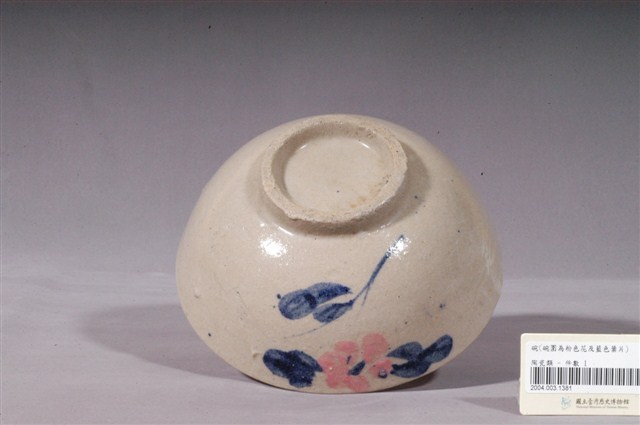1.這件青花粉紅釉彩花卉紋碗,是鶯歌產製的日用食具。圓唇,直口,圓腹,弧壁下斂至圈足。足部露胎。除圈足外全器施釉,釉面稍有氣泡、顆粒。碗內素面無紋,外壁以青花釉料描繪枝葉及花蕊、鉻錫紅色料描繪花瓣,形成簡單的青花粉紅彩花卉紋,鉻錫紅色料濃重,稍有積釉突起。2.北投地區在1950年代引進氧化鉻作為色料,讓產品的彩繪紋飾更富有變化。例如氧化鉻成分之鉻錫紅色料可發出粉紅色彩,與青花搭配描繪成梅花或蘭花等花卉紋。氧化鉻也可發出綠色、褐色、黑色等色彩,除了被用於描繪傳統梅蘭竹菊紋樣之外,還被用在描繪椰子樹、海景等代表南國風情的裝飾圖案。這種色料也隨著北投技術人員到鶯歌發展而得以廣為傳播,成為臺灣早期北部窯產製碗盤的普遍裝飾。