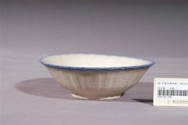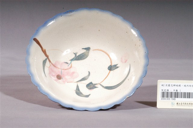 1.本件是青花釉彩花卉紋花口碗,花口外撇,弧腹,平底,圈足。器身沿花口劃印直線紋,呈放射狀,使全器有如花朵般綻放。全器施釉,圈足刮釉露胎,胎土潔白。裝飾圖案上,口沿施淺藍色一周,內底靠近口沿繪細長而圓轉褐釉弧線作折枝、褐點作花蕊,並以幾筆綠彩畫出葉片、以粉紅釉點出花瓣,形成簡單的花卉紋飾,筆法率性,看起來活潑輕快。2.北投窯的裝飾方式大部分以手工繪彩為主,是北投地區的特色之一,在日治時代就已經有釉上及釉下彩兩種。色彩上,初期以單色釉為主,以青花與鐵繪為大宗,戰後增加了青花粉紅彩、青花綠彩,或黃、淺紫色等不同變化。裝飾圖案則常見梅、蘭、竹、菊四君子等花草紋樣,整體風格顯得較為樸實。戰後初期花卉紋仍為最普遍的裝飾紋樣之一,描繪筆法大多率性、隨意,較為抽象簡化。