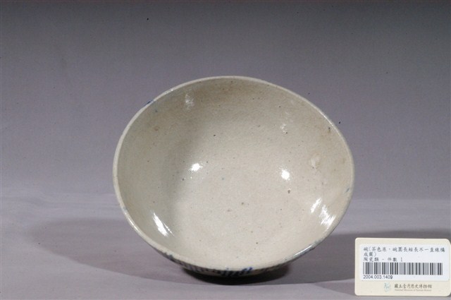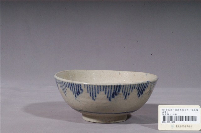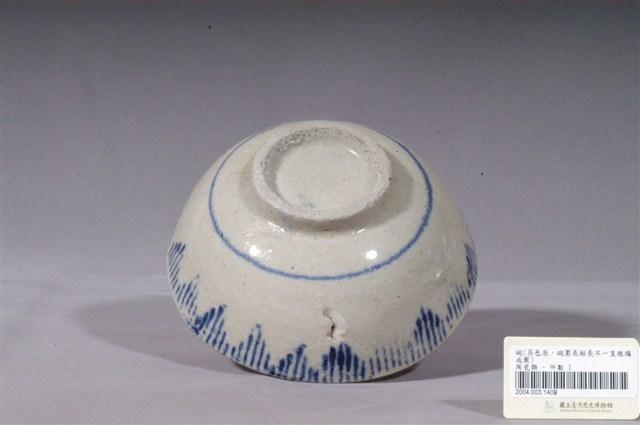 1.青花印花線紋碗公,敞口,弧壁下收,圓腹,底有圈足,以模具成形,釉下印花青花裝飾之後燒製而成。全器滿釉,碗內外壁施罩白釉,略帶灰色調,釉面開片,碗外壁腹部中段有一點狀凸起與一破損。碗內壁素面無紋,碗外壁腹部下方飾一道青花弦紋,口緣採印花技法裝飾一圈青花短直線紋,圖案由七道長短不一的短直線為一組,中間的直線最長向漸向二旁縮短呈倒三角狀,因蓋印力道大小不均,有些直線較粗、有些較細,且有部分圖案不完整。2.碗的形制有分較大的湯碗和較小的飯碗,湯碗臺灣民間俗稱「碗公」,多用來盛裝菜湯,是臺灣家庭中常見的民生瓷器。本物件屬於形制較大的湯碗,碗壁上採用印花技法裝飾以增加工作效率,方法是將圖案先刻在橡皮圖章上,以圖章沾染釉料印在器皿上,燒製後即得所需圖案。