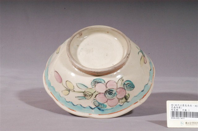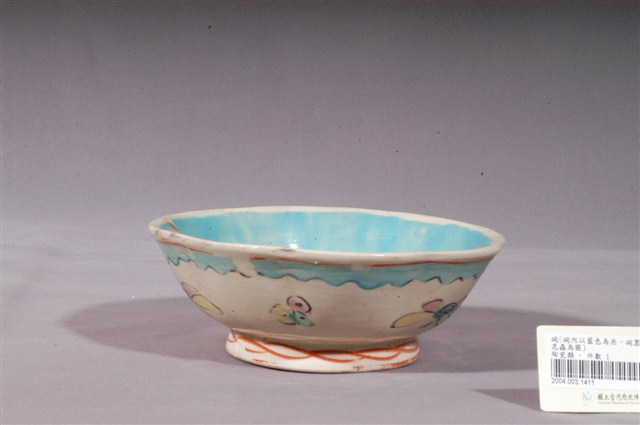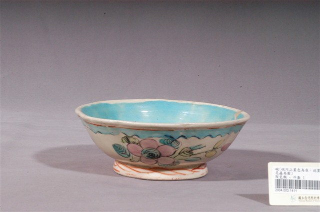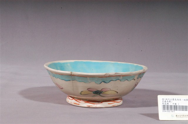1.本件彩繪花卉紋碗,是中國華南地區產製的日用器皿,以廣東地區產製的可能性更大。器形呈外翻的波浪狀口沿、曲弧略小,弧壁至底部下收,圈足略高並微微外撇。通體施釉,以乳白色釉為地,碗內並填滿鮮豔的藍綠色釉作裝飾。外壁彩繪花卉紋,圈足外及近口沿處以鮮紅色釉繪弦紋,外壁上半部以藍綠色釉及黑釉繪波紋線條,與藍綠釉、粉紅釉、黃釉及綠釉組成之花卉紋相襯,整體風格鮮豔明麗,為典型的Nyonya ware(娘惹瓷),作果子碟之用。2.清末民初時期,麻六甲海峽一帶華人受歐洲文化影響,向中國景德鎮或江西省私人瓷窯訂製粉彩瓷器,稱為娘惹瓷(Peranakan Chinese Porcelain or Nyonya ware)。娘惹瓷的特色是使用濃郁而明艷的釉彩作裝飾,器形多樣,包括蓋盅、茶杯、盤、碟、湯匙、睡壺、花瓶等等。