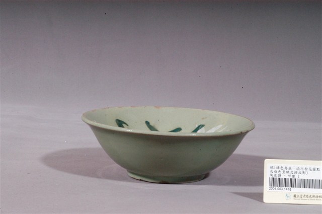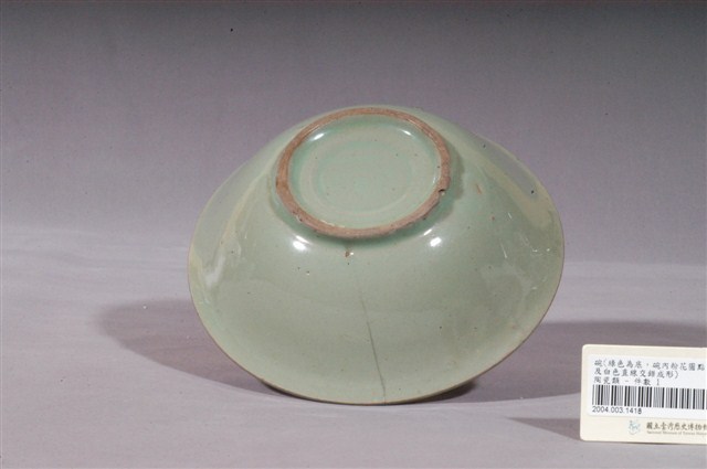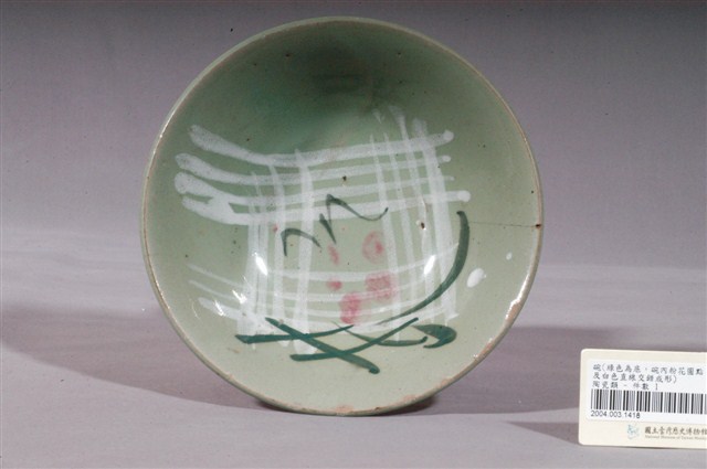 1.綠釉手繪花卉紋碗公,為形制較大的湯碗,民間俗稱「碗公」。撇口,唇帶稜角,弧壁下收,圓腹,碗身較淺,底有圈足,以模製成形,外碗心壓模同心圓形和細弦紋,增添造型變化。全器施綠釉,表面帶有明顯氣孔,圈足底露胎,胎為褐色。圈足有一小缺角,口沿有三、四處碰磕碰痕跡,口沿內、外側的釉料可能因使用磨損而露胎呈一圈褐色,碗外壁有一道明顯裂痕,自口沿向下延伸至腹部下方。碗外壁素面無紋,主要紋飾繪於碗心,以中央一朵粉紅花朵為主體,綠彩細紋寫意枝葉,碗面刷毛白泥輕,由四條細直條紋組成四道寬帶,相互交錯形成格狀紋,作為背景以增添變化。2.粉紅彩紋飾經常出現在鶯歌碗盤中,這種釉彩的應用在日治時期已開始流行,戰後仍沿用許久。早期碗盤多只用青花裝飾,約1950年代業者開始使用粉紅彩搭配青花,之後又出現綠色、褐色等其他顏色的著色劑,發展出釉下多彩,使裝飾色彩應用更加多元。
