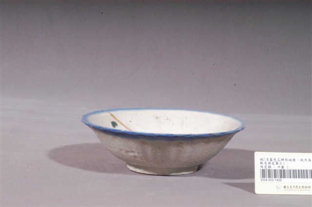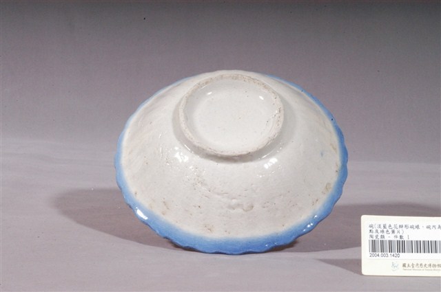 1.本件為彩繪花卉紋碗,器形呈花口,淺弧壁,圈足。淺青色釉,花瓣型的口沿為藍色漸層,有顆粒、氣泡、黑點。紋飾表現於碗內面底部,用畫筆以隨意的筆觸來表現粉色折枝花卉、綠色樹葉及咖啡色樹幹等,風格簡單隨性。臺灣戰後日用碗盤的裝飾以手繪來表現是常見的手法,可看到以植物花卉、花鳥、魚蝦、風景、幾何圖形、文字紋飾等釉下彩的圖案裝飾碗盤。2.清代至日治時期臺灣碗盤陶瓷器主要由日本及中國大陸進口,直到1930年代後在日政府的鼓勵下,生產碗盤的窯廠在北、中、南部陸續出現。從1950-1960年代,碗盤生產集中在北投和鶯歌,1969年北投陶瓷廠關閉,許多窯場逐漸轉移到臺北市近郊的鶯歌地區。使鶯歌地區因為地緣性的關係,發展成為臺灣陶瓷重鎮。