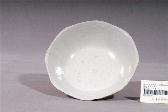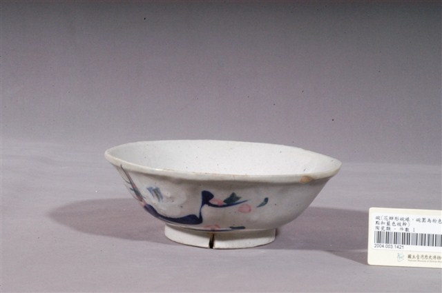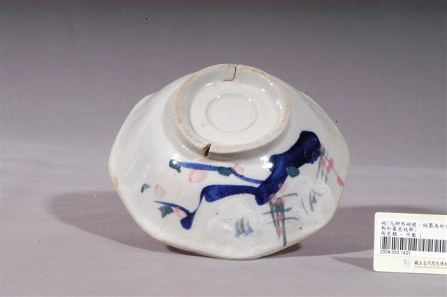 本件彩繪花卉紋碗,器形為圓唇,花口、曲弧小,口略微外折,弧壁,至底部下收,圈足,圈足一道裂痕。通體施釉,釉面有光澤。器內壁素面無紋,外壁則以藍釉、粉紅色釉、綠釉及白釉手繪花卉紋,彩釉發色濃烈。繪彩筆跡粗略,具民窯色彩,為大量產製之常民普遍使用的日用陶瓷器。而從整體質地與釉色來看,可能屬北投地區產製,但仿花口碗的形制較之以往少見。