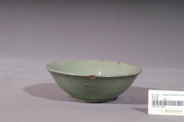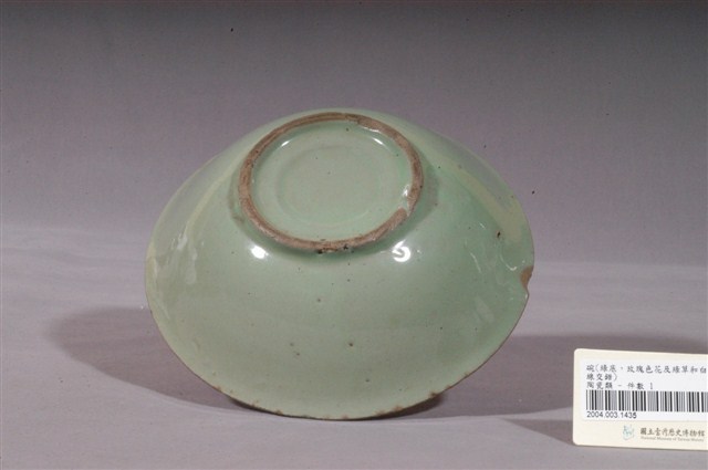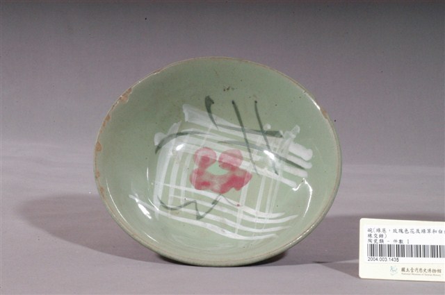 1.綠釉手繪花卉紋碗公,為形制較大的湯碗,民間俗稱「碗公」。撇口,唇帶稜角,弧壁下收,圓腹,碗身較淺,底有圈足,以模製成形,外碗心壓模同心圓形和細弦紋,增添造型變化。全器施綠釉,表面帶有明顯氣孔,圈足底露胎,胎為褐色。口沿有數個碰撞角,口沿內、外側的釉料可能因使用磨損而露胎呈一圈褐色。碗外壁素面無紋,主要紋飾繪於碗心,以中央一朵粉紅花朵為主體,綠彩細紋寫意枝葉,碗面刷毛白泥輕,由四條細直條紋組成四道寬帶,相互交錯形成格狀紋,作為背景以增添變化。2.粉紅彩紋飾經常出現在鶯歌碗盤中,這種釉彩的應用在日治時期已開始流行,戰後仍沿用許久。早期碗盤多只用青花裝飾,約1950年代業者開始使用粉紅彩搭配青花,之後又出現綠色、褐色等其他顏色的著色劑,發展出釉下多彩,使裝飾色彩應用更加多元。