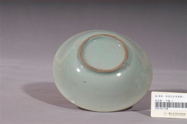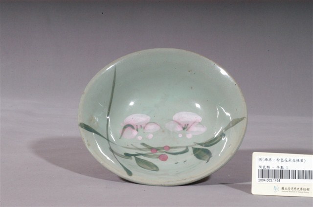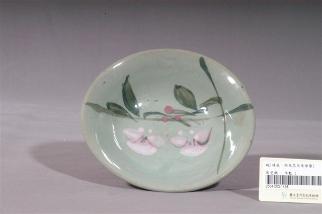 1.綠釉手繪花卉紋碗公,為形制較大的湯碗,民間俗稱「碗公」。撇口,唇帶稜角,弧壁下收,圓腹,碗身較淺,底有圈足,以模製成形,施釉彩繪裝飾後高溫燒成。全器施綠釉,表面帶有氣孔,釉厚薄不均,釉層較淺的地方略透胎色,圈足底露胎,胎為褐色。碗外壁素面無紋,主要紋飾繪於碗心,以黛綠和粉紅釉彩採沒骨技法描繪折枝花卉,可能為蘭花之類的花朵。2.臺灣戰後初期的碗盤一開始多只用青花裝飾,約1950年代業者開始使用粉紅彩搭配青花,之後又出現綠色、褐色等其他顏色的著色劑,發展出釉下多彩,使裝飾色彩應用更加多元。