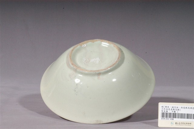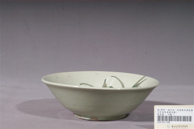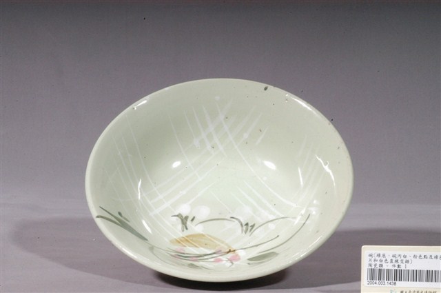 1.淡綠釉手繪花卉紋碗公,為形制較大的湯碗,民間俗稱「碗公」。撇口,弧壁下收,圓腹,底有圈足,以模製成形,施釉彩繪裝飾後高溫燒成。全器施淡綠釉,表面帶有明顯氣孔,釉厚薄不均,碗底心和碗外壁下半有些釉層較薄的地方略透胎色,圈足底露胎,胎為淺褐色。碗外壁素面無紋,主要紋飾繪於碗內壁一側,褐色枝幹與綠色葉片之間點綴粉紅色圓點小花,碗面刷毛白泥輕,由四條細直條紋組成四道寬帶,相互交錯形成格狀紋,作為背景以增添變化。2.臺灣戰後初期的碗盤一開始多只用青花裝飾,約1950年代業者開始使用粉紅彩搭配青花,之後又出現綠色、褐色等其他顏色的著色劑,發展出釉下多彩,使裝飾色彩應用更加多元。