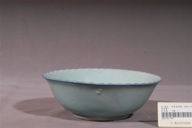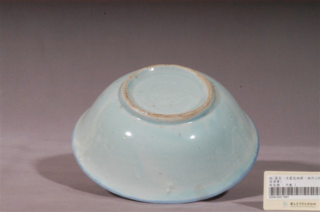 1.這件藍地粉紅釉花卉紋碗,敞口外侈,口沿壓印斜向篦劃紋作花邊、塗青料,圓腹,弧壁至底部漸收,寬圈足。通體施釉,器身有流釉痕跡,並有氣泡、顆粒。碗以淺藍色釉為底,外壁素面無紋,碗內壁繪花卉紋,使用粉紅色釉繪出花朵,以墨綠釉點畫出葉片,並繪幾道細長線條作為主要構圖區域,運筆俐落瀟灑。2.經歷日本人的經營及生產技術引進,戰後初期,北投地區仍為臺灣最重要的陶瓷生產中心。日治時期成立的「北投窯業株式會社」被政府接收,改組為臺灣工礦公司轄下的「北投陶瓷耐火器材廠」。窯廠積極開發新產品,如馬賽克瓷磚、瓷磚畫、衛生陶瓷、藝術陶瓷等等。在日用器皿上,除了白瓷之外,也生產青瓷,胎釉皆更加細緻。而受市場歡迎的粉紅色釉也開始具深淺變化,並被廣為運用在描繪紋飾上。