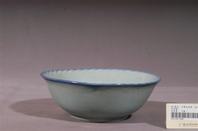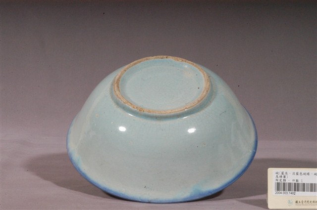 1.這件藍地粉紅釉花卉紋碗,敞口外侈,口沿壓印斜向篦劃紋作花邊、塗青料,圓腹,弧壁至底部漸收,寬圈足。通體施釉,釉面有光澤。碗有開片現象,器底紋路明顯。以淺藍色釉為地,外壁素面無紋,碗內繪花卉紋,使用粉紅色釉繪出花朵,以墨綠釉點畫出葉片,並繪幾道細長線條作為點綴,運筆俐落,線條流暢。2.經歷日本人的經營及生產技術引進,戰後初期,北投地區仍為臺灣最重要的陶瓷生產中心。日治時期成立的「北投窯業株式會社」被政府接收,改組為臺灣工礦公司轄下的「北投陶瓷耐火器材廠」。窯廠積極開發新產品,如馬賽克瓷磚、瓷磚畫、衛生陶瓷、藝術陶瓷等等。在日用器皿上,除了白瓷之外,也生產青瓷,胎釉皆更加細緻。而受市場歡迎的粉紅色釉也開始具深淺變化,並被廣為運用在描繪紋飾上。