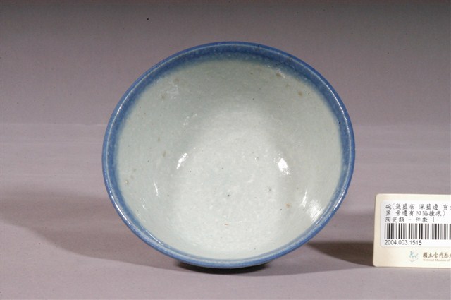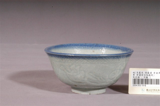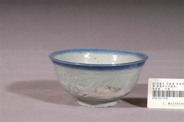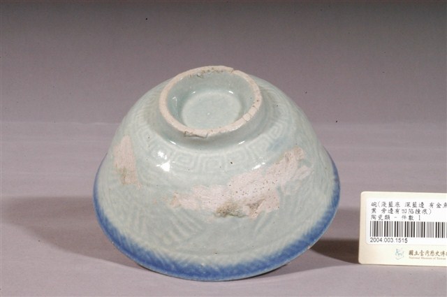 1.本件為淺藍釉魚鳥扇壓紋碗,器形為撇口,深圓腹,圈足。施淺藍釉,口沿為深藍漸層,釉色不均,有明顯的顆粒、氣泡,器腹外壁有多處碰撞損傷,而露出白色胎體。外壁的圖形以壓模的方式製作,靠近口沿有一圈竹篾紋,靠近圈足處有一圈回紋,器腹中央有展翅的鳥、金魚、竹葉片、展開的扇子等圖案,浮雕紋路並不明顯。2.鶯歌陶業始於清嘉慶九年,早期的產品主要是厚重的缽、罐、壺、缸、甕 等廚房日用粗陶器、磚、瓦建築相關器物,以及花盆等,碗盤並不在生產之列。中日戰爭爆發後,日本的陶瓷器不易取得,加上當時有北投的工人轉往鶯歌發展,因而促使鶯歌的製碗業興盛起來。1930–1960年代,鶯歌為臺灣燒製碗盤的主要地區,鶯歌生產的碗盤早期大多為麵食攤及農村所用的器皿,極為厚重粗糙,1950年以後品質逐漸提升。