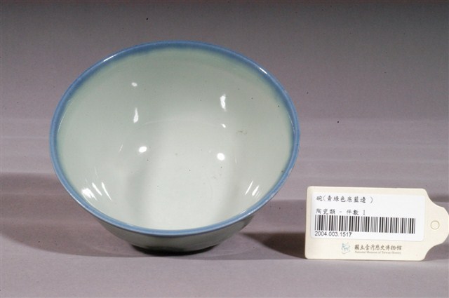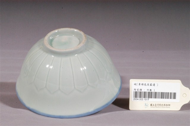 1.本件為青綠彩蓮花壓紋碗,器形為撇口,深圓腹,圈足。施淺青綠釉,碗緣為深藍漸層,外壁的圖形以壓模的方式製作,以圈足為中心,在器腹上壓印出放射狀的蓮花瓣,整體造型簡單雅致。2.鶯歌陶業始於清嘉慶九年,早期的產品主要是厚重的缽、罐、壺、缸、甕 等廚房日用粗陶器、磚、瓦建築相關器物,以及花盆等,碗盤並不在生產之列。中日戰爭爆發後,日本的陶瓷器不易取得,加上當時有北投的工人轉往鶯歌發展,因而促使鶯歌的製碗業興盛起來。1930–1960年代,鶯歌為臺灣燒製碗盤的主要地區,鶯歌生產的碗盤早期大多為麵食攤及農村所用的器皿,極為厚重粗糙,1950年以後品質逐漸提升。