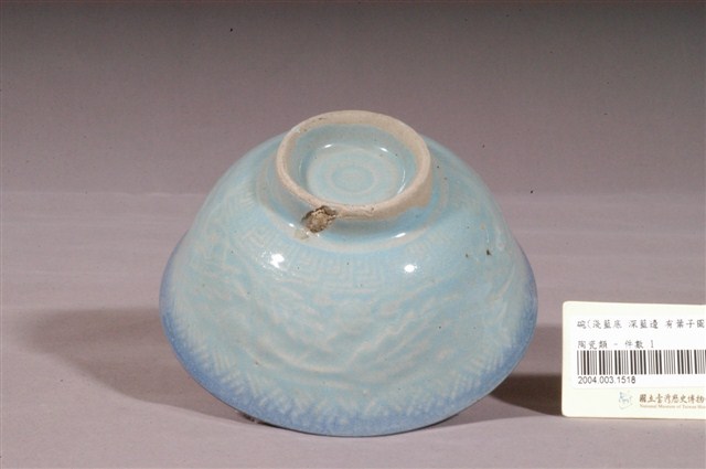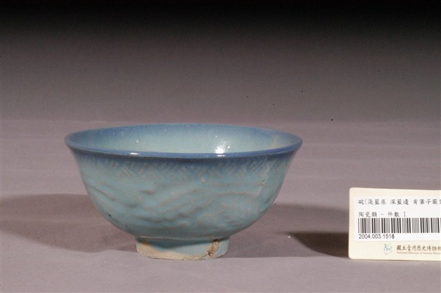 1.本件為淺藍釉樹葉壓紋碗,器形為撇口,深圓腹,圈足。施淺藍釉,口沿為深藍漸層,碗內壁有顆粒、氣泡,圈足處一明顯的損傷痕跡。碗外壁的圖形以壓模的方式製作,靠近口沿處有一圈竹篾紋,靠近圈足處有一圈回紋,器腹中間則是鋸齒狀葉片及梅花交叉錯落,但圖案紋路不明顯。2.鶯歌陶業始於清嘉慶九年,早期的產品主要是厚重的缽、罐、壺、缸、甕 等廚房日用粗陶器、磚、瓦建築相關器物,以及花盆等,碗盤並不在生產之列。中日戰爭爆發後,日本的陶瓷器不易取得,加上當時有北投的工人轉往鶯歌發展,因而促使鶯歌的製碗業興盛起來。1930–1960年代,鶯歌為臺灣燒製碗盤的主要地區,鶯歌生產的碗盤早期大多為麵食攤及農村所用的器皿,極為厚重粗糙,1950年以後品質逐漸提升。