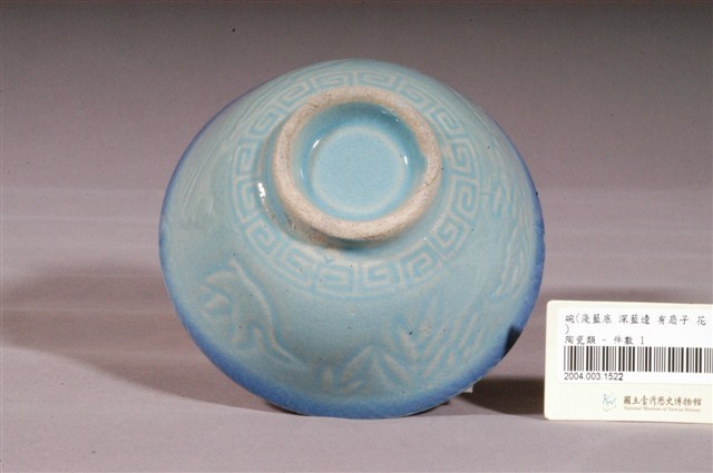 1.本件為淺藍釉花鳥扇壓紋碗,器形為撇口,深圓腹,圈足。施淺藍釉,口沿為深藍漸層,有顆粒、氣泡,以碗外壁較為明顯。外壁的圖形以壓模的方式製作,靠近口沿有一圈竹篾紋,靠近圈足處有一圈回紋,器腹中央印有展翅的鳥、帶葉的花朵、竹葉片、展開的扇子等圖案,壓印紋路較為粗糙。2.鶯歌陶業始於清嘉慶九年,早期的產品主要是厚重的缽、罐、壺、缸、甕 等廚房日用粗陶器、磚、瓦建築相關器物,以及花盆等,碗盤並不在生產之列。中日戰爭爆發後,日本的陶瓷器不易取得,加上當時有北投的工人轉往鶯歌發展,因而促使鶯歌的製碗業興盛起來。1930–1960年代,鶯歌為臺灣燒製碗盤的主要地區,鶯歌生產的碗盤早期大多為麵食攤及農村所用的器皿,極為厚重粗糙,1950年以後品質逐漸提升。