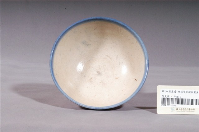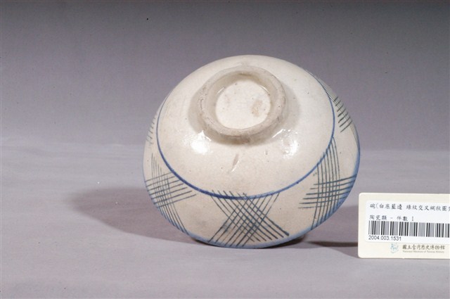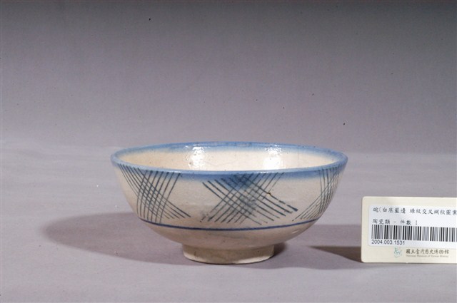1.本件為青花綠彩線紋碗,厚胎,圓唇,直口外敞、口塗淺色青料,深圓腹,弧壁下收,圈足厚且寬。以青花及墨綠釉繪彩裝飾,器身繪一道青花弦紋,並以橡皮印章沾墨綠釉在口沿及弦紋間蓋上一組一組交叉斜線,形成斜面交錯網格的紋樣,為北投燒、大屯燒兩大系統陶瓷廠常見的碗公裝飾。這類碗公大多沒有署款,北投燒與大屯燒兩大系統衍生的窯廠直到1970年代都持續生產這類碗公。2.北投可說是臺灣最早燒造碗盤日用器皿的地區,也是引入現代窯爐,採用新技術的門戶。北投窯業株式會社成立後,經營者後宮信太郎率先引進源於歐洲的「燃煤四角窯」,其優勢是溫度平均,燒成率高,且能大量產製,對臺灣陶瓷產業現代化有相當大的貢獻。