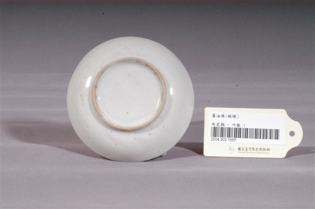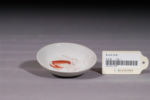 1. 印繪白瓷紅蝦圓碟圓唇,平口,淺腹,弧壁下收至圈足,圈足露胎,胎色白皙,胎質略粗。全器施白釉,釉色微微泛黃,釉面光潔,不過器表有許多因高溫燒製導致而成的氣孔,釉面較不平整。碟外壁素面無紋飾,碟心轉印一紅色大蝦紋樣,以模具施紅釉勾勒出蝦紋的輪廓,但因長年使用故輪廓較不清晰;蝦身大筆填彩,透過顏色漸層變化表現出立體感。紋飾的紅釉呈色鮮豔,但因使用痕跡而有所磨損,整體紋樣圖案化,線條表現生動。2. 尺寸較小、器深較淺的碟子俗稱「醬料碟」,一般用來放置調味料,也可當作放置母匙、湯匙等的小碟子。