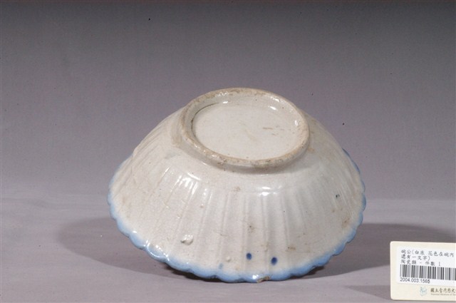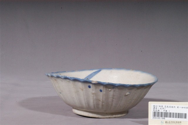 1.這件彩繪山水紋花口碗,是北投窯廠產製的日用陶瓷器皿。口呈花瓣形外侈、歪斜、塗青料,深圓腹,弧壁靠近底部下收,寬圈足。通體施釉,釉色乳白,略有顆粒、氣泡,並有細微開片紋。裝飾技法上,外壁沿花口壓印豎直長紋,製造出如花朵綻放一般的效果。彩繪集中於碗內,以印花加彩的方式表現。先用印章蓋印屋舍圖樣,再以青花搭配墨綠釉與紅釉彩繪樹林與海景、山景,筆法潦草簡略。遠山的山形特別,對照相類圖案,知其源自於日本富士山錐狀山體與白雪靄靄的面貌,從中可見北投窯彩繪圖案與日本陶畫題材的傳承關係。2.日人進入北投經營窯業,也將日本時常使用的陶畫題材引進臺灣,山水紋飾即是其中一個例子。這種圖案的構圖大多是繪左側海洋中有出航的船舶,右側岸上有屋舍、樹木,上方繪遠山及鳥群。此類紋飾從日治時代起便被使用在日用器皿上,直到戰後仍被延續使用。