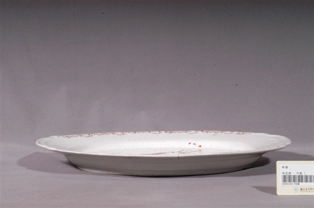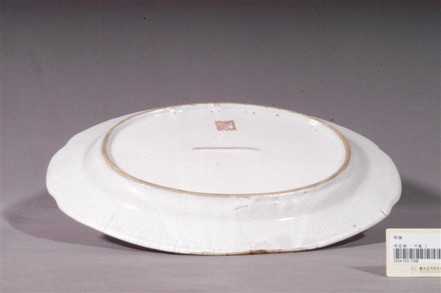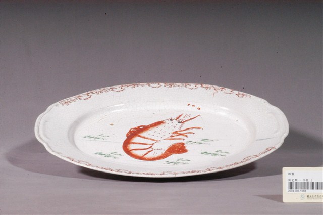 1. 印繪紅蝦折沿橢圓盤為高溫燒製且以模具塑成形,圓唇,寬折沿,兩端做耳狀,淺腹,弧壁短,下斂至圈足,圈足露胎,胎色白中略帶黃,胎質細膩。全器施白釉,呈色雪白潤澤,釉面光滑。盤外壁素面無紋,圈足內中央有一條凸起,應是模具痕跡。折沿兩端較窄處以凸起線條為裝飾,凸顯出耳狀的設計;其餘的折沿處則以紅釉轉印線條為主的花草狀紋飾。主要紋飾繪於盤內中心,以模具勾勒出大蝦的輪廓,再以紅釉為蝦身填彩,紅釉發色飽和,蝦身用釉用色較濃重。大蝦周圍以較淡的綠色釉繪製水草五組,並以數筆淡藍色釉暗示出水波紋,更完整地呈現水中環境。