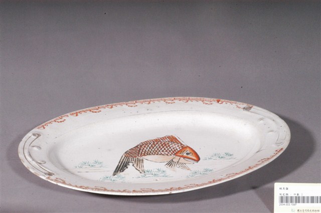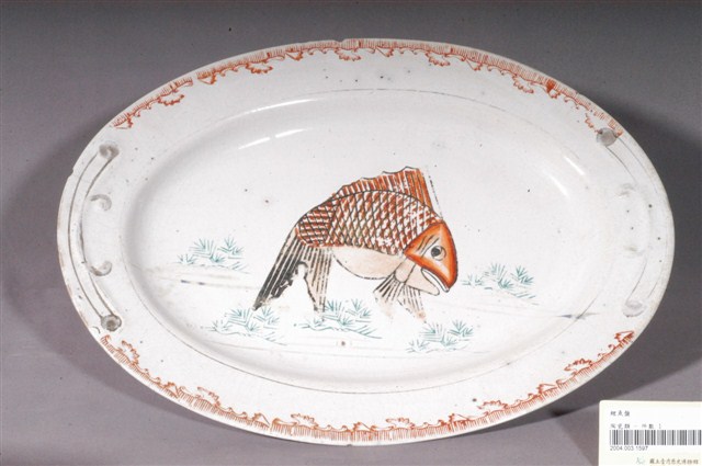 1.印繪紅釉鯉魚紋橢圓盤為高溫燒製且以模具塑成形,圓唇,寬折沿,口沿稍微不平整,淺腹,弧壁短,下斂至圈足,圈足露胎,胎色白中略帶黃,胎質細膩。全器施白釉,呈色淨白潤澤,釉面光滑,有少許雜質沈澱,且口沿多有破損。盤外壁素面無紋,折沿處則以紅釉轉印線條為主的花草狀紋飾,兩端另以銀色線條描繪,模擬雙耳托盤般的效果。由於紋飾以模板轉印,可見模板之間重疊交印的狀況。主要紋飾為繪於盤內的大尾鯉魚。鯉魚以模板轉印,通身以紅色釉表現,釉色略為偏橘,呈色飽滿有層次。紋飾以側邊視角描繪,以簡單的線條掌握細節,風格稚樸。除了魚