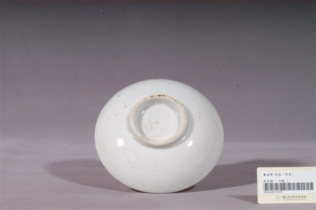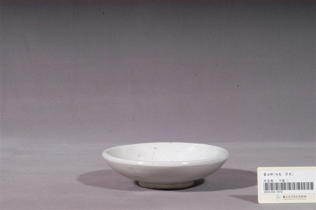 1.素面小圓碟圓唇,平口,圓腹,斜壁下收至圈足,圈足徑略偏小,約等小於口徑的一半大小,圈足露胎,胎色灰中帶黃,胎質較為粗糙。全器施白釉,釉面瑩潤,呈色白中略帶灰色調,釉色均勻,釉面略有些雜質,且有縮釉與氣孔,碟心處可見開片痕跡,皆是高溫燒製導致的結果,但整體釉面仍具有溫潤的光澤。2.此類形制較小的盤碟,通常作為盛裝小菜、醬料等佐料的容器,是民間十分常見的日用器皿,因此通常以量產製造,裝飾通常簡單素雅。