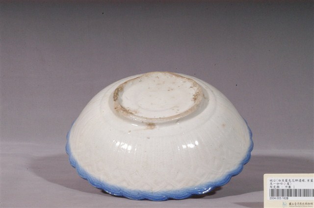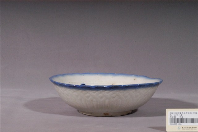 1.這件彩繪山水紋花口碗,是北投窯廠產製的日用陶瓷器皿。口呈花瓣形外敞、口沿塗一圈青料作裝飾,弧壁,靠近底部漸收斂,寬圈足,圈足低矮、稍有變形。通體施釉,釉呈乳白色,釉面有光澤。外壁以壓印方式裝飾,上半部印織紋一圈,下半部印豎長線條、作放射狀。彩繪集中於碗內,以手繪的方式表現。以青花為主色調,搭配墨綠釉與褐釉繪出樹林、屋舍、海洋、及遠山。其中青花釉料含有的水份較多,繪彩時可見濃淡之分,具暈染漸層的效果,承襲了日本使用青花描繪裝飾的特色。2.日人進入北投經營窯業,也將日本時常使用的陶畫題材引進臺灣,山水紋飾即是其中一個例子。這種圖案的構圖大多是繪左側海洋中有出航的船舶,右側岸上有屋舍、樹木,上方繪遠山及鳥群。此類紋飾從日治時代起便被使用在日用器皿上,直到戰後仍被延續使用。