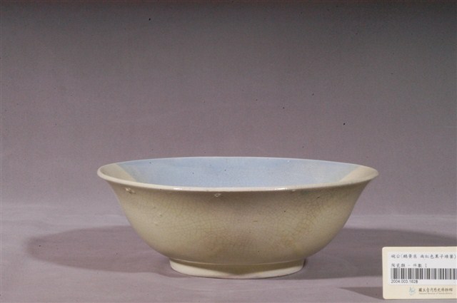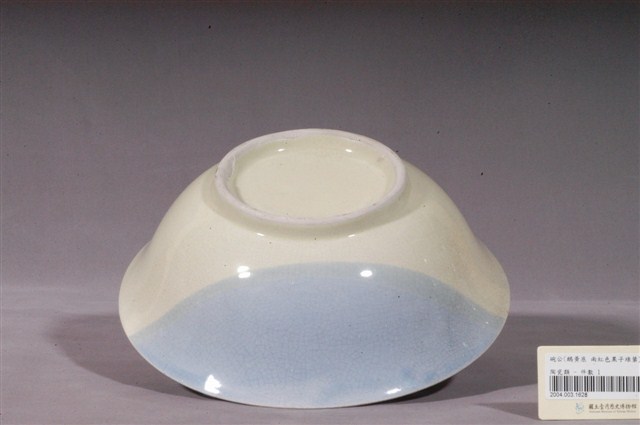 1.本件為彩繪水果紋碗公,器形呈撇口,弧壁,底部有圈足。施米黃色釉,多顆粒、氣泡,有開片現象,尤其以口沿內壁及器腹外壁特別明顯,口沿有一紅色圓點,推測應為手繪圖案時,顏料不慎滴落所致。碗緣沿著碗壁有一內外對稱淺藍色弧形區塊,內壁的藍色弧形區塊上靠近底部有繪有兩顆帶有枝葉的紅色果子,畫風簡單寫意。手繪法為鶯歌碗盤上紋飾的主要特色。2.鶯歌陶業始於清嘉慶九年,早期的產品主要是厚重的缽、罐、壺、缸、甕 等廚房日用粗陶器、磚、瓦建築相關器物,以及花盆等,碗盤並不在生產之列。中日戰爭爆發後,日本的陶瓷器不易取得,加上當時有北投的工人轉往鶯歌發展,因而促使鶯歌的製碗業興盛起來。1930–1960年代,鶯歌為臺灣燒製碗盤的主要地區,鶯歌生產的碗盤早期大多為麵食攤及農村所用的器皿,極為厚重粗糙,1950年以後品質逐漸提升。
