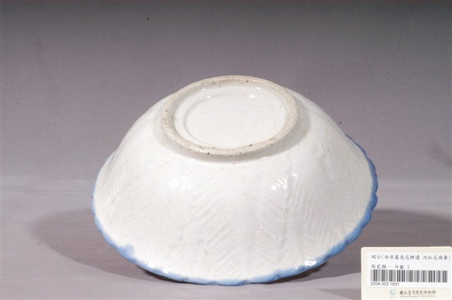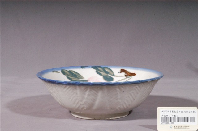 1.本件是彩繪花卉紋花口碗,是北投地區產製的常民日用食具。折沿口作花瓣狀、曲弧小、塗青料,圓腹,弧壁至底部下收、壁壓印蕉葉紋,寬圈足、足部中心壓印內凹圓形紋。通體施釉,圈足刮釉露胎,胎質細密潔白。碗內手工彩繪折枝花卉紋,以墨綠釉繪葉片,褐釉繪花蕊與枝幹,粉紅釉圈繪花瓣,線條快速有力。紋飾位置偏向口沿處,於碗內留下大片空白,是北投窯彩繪構圖的特色。2.北投窯的裝飾方式大部分以手工繪彩為主,是北投地區的特色之一,在日治時代就已經有釉上及釉下彩兩種。用色上,初期以單色釉為主,以青花與鐵繪為大宗,戰後又增加了青花粉紅彩、青花綠彩,或黃、淺紫色等不同變化。日治時期的裝飾圖案常見梅、蘭、竹、菊等花草紋樣;至戰後花卉紋仍為最普遍被運用在日用器皿上的紋飾之一,描繪筆法大多恣意隨性,構圖及釉彩的組合則較前期有更靈活的表現。