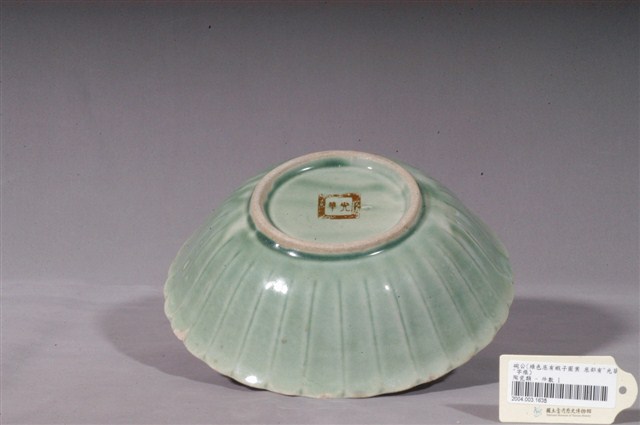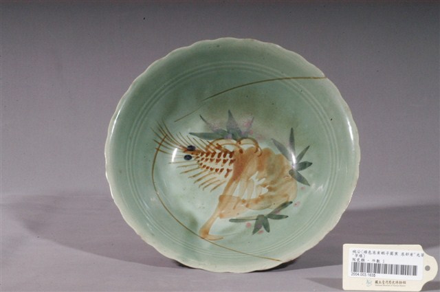 1.這件青瓷蝦紋碗,是北投光華陶瓷公司生產的日用陶瓷。器形呈花形,折沿口,弧壁,近底部內收,平底,圈足。圈足露胎,胎土細緻,胎質堅硬。除圈足外通體施釉,釉面有光澤,底部有積釉現象。在裝飾技法上,碗外壁沿花口印劃直線紋樣,製造碗公似花朵般綻放的效果;內壁近口沿處劃三道弦紋裝飾。內底手繪蝦子圖案,筆觸率意疏放。蝦紋是臺灣早期碗盤中常見的紋樣,表示所食豐盛,象徵著富裕。外底圈足內署「光華」商標。2.光華陶瓷公司是金義和公司在戰後到北投經營的陶瓷公司。金義和公司在日本時代創立於艋舺,後來北投光華與艋舺金義和兩廠合併,北投的光華陶瓷才改回金義和的名稱。公司以燒製「鶴紋碗」起家,並在戰後持續經營至1980年代,雖曾一度也生產西洋玩偶,不過主要仍是生產日用陶瓷,在裝飾技法上則有釉上與釉下彩兩種。