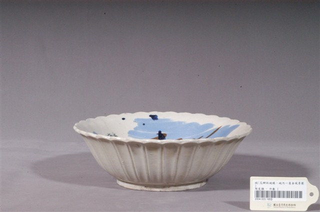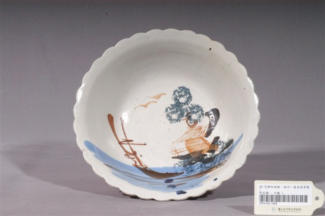 1.這件彩繪海景圖花口碗,是北投窯廠產製的日用陶瓷器皿。花口呈波浪狀外敞,弧腹,靠近底部漸收接圈足。足部露胎,胎白,質地細密堅硬。碗外壁沿花口壓印豎直長紋,壓印花紋明顯,稜脊突出。全器施釉,釉色乳白。碗內描繪海景圖案,先以橡皮印章印屋脊圖案,再以幾筆淡藍色釉作海浪,褐釉作帆船,墨綠釉、黑釉、濃青釉作點綴,運筆率性,圖案簡化。2.日人進入北投經營窯業,也將日本時常使用的陶畫題材引進臺灣,海景圖即是其中一個例子。這種風景圖案的構圖大多是繪左側海洋中有出航的船舶,右側岸上有屋舍、樹木,上方繪遠山及鳥群。海景圖從日治時代起便被使用在日用器皿上,直到戰後仍被延續使用。