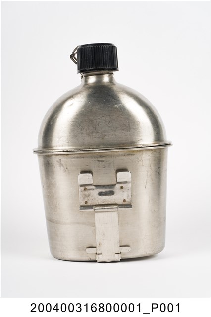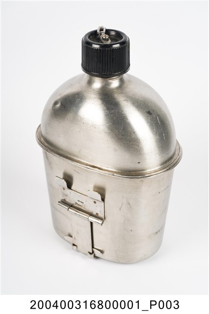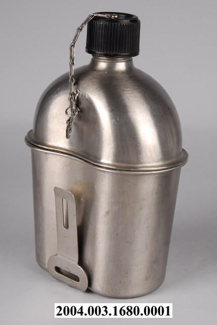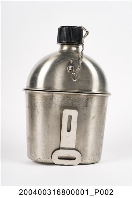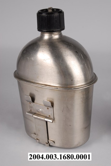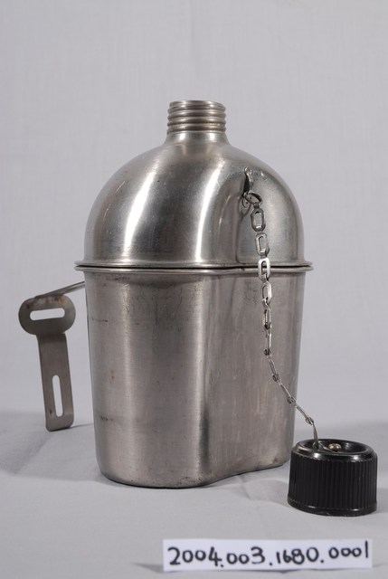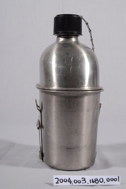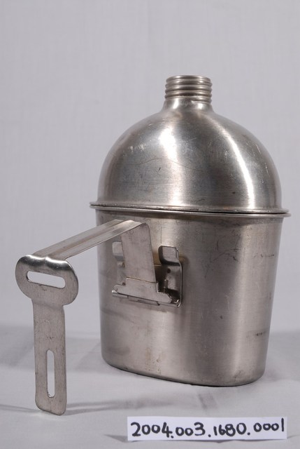 本件水壺主體與鋼杯為不鏽鋼製軍用水壺部件之一。壺身以不鏽鋼製成,外觀為銀灰色,圓口,細頸,圓弧肩,直壁,壺身為扁橢圓形,一側中央略凹陷,壺身三分之一處作一道折沿,肩部中央釘有一扣環,接一條不鏽鋼鏈,尾端連接黑色電木壺蓋,可用旋轉的方式與頸部的螺紋密合,防止液體滲出。杯子以不鏽鋼製成,外觀為銀灰色,呈扁橢圓形桶狀,口沿外折,可與壺身相疊,杯身一側釘有一塊凹形鐵片,以鉸鍊連接一塊三折長條型鐵片,使其可活動繞過底部收納,或拉開作為把手方便持拿。