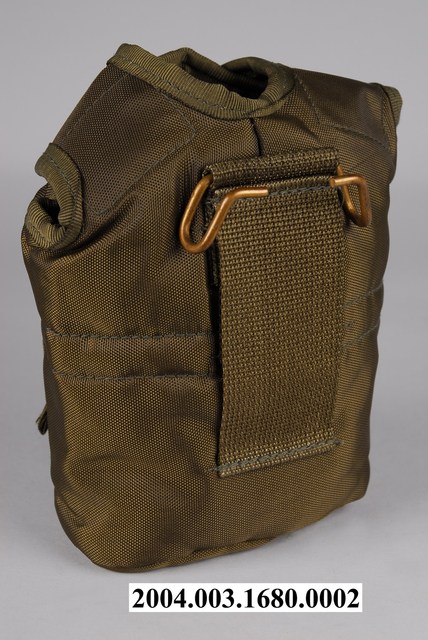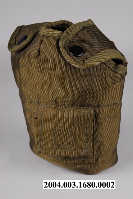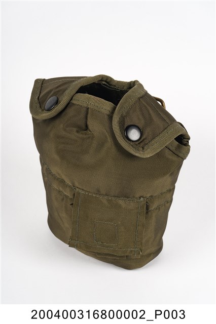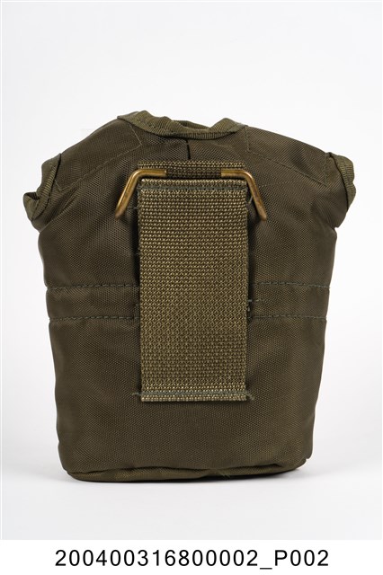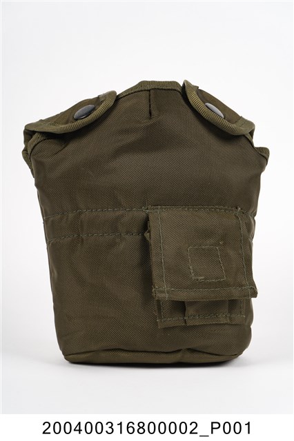 本件水壺袋為不鏽鋼製軍用水壺部件之二,以尼龍帆布製成,呈扁橢圓袋狀,外觀為軍綠色,頂端開口一側作二圓耳狀,可覆蓋於水壺肩部並以四合扣固定,袋內舖有絨毛,具有保溫效果。水壺袋的前側下方縫有一方形小口袋,後方縫有一方形布塊,左右貫通,布條上方固定一金屬鈎,便於將水壺固定於腰際。