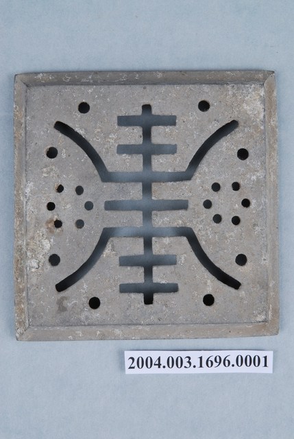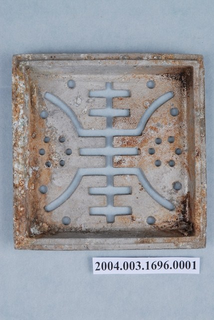 本文物為粉盒壽字蓋,四方形形狀,盒蓋外觀為鏤空的壽字雕刻,以及設有小孔洞。盒蓋內外表面有多處的生鏽與污漬。為當時婦女用來放胭脂粉的容器。女性臉上的妝扮為其對特定生活之想像,相對地女性之美也時常受限於社會傳統價值觀,妝扮女性的化妝品及其附屬產品,則體現了社會審美觀和科技的變動。