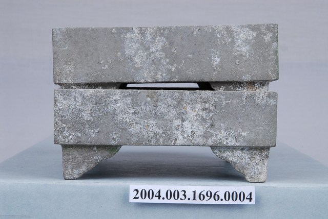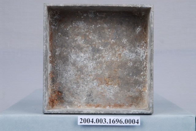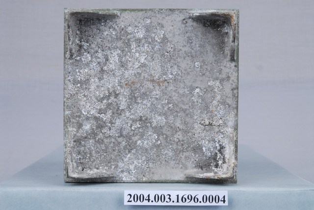 本文物為粉盒第2層及底層,四方形形狀,底部設有4個角架,可接合於其他層。粉盒表面有多處的生鏽與污漬。可裝入胭脂粉,為當時婦女放置化妝品的容器。女性臉上的妝扮為其對特定生活之想像,相對地女性之美也時常受限於社會傳統價值觀,妝扮女性的化妝品及其附屬產品,則體現了社會審美觀和科技的變動。