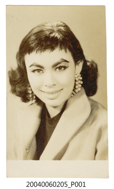 1.姓名不詳的明星黑白半身劇照,直式單面、背景為白,女明星身穿西裝大衣,黑色內裡,一雙粗眉凸顯英氣,露齒微笑看起來精神抖擻,表面有上一層霧膜的感覺。2.推測此明星為1950-1960年代的電影女明星,以妝容來看應該與林黛、李麗華為同一時期。